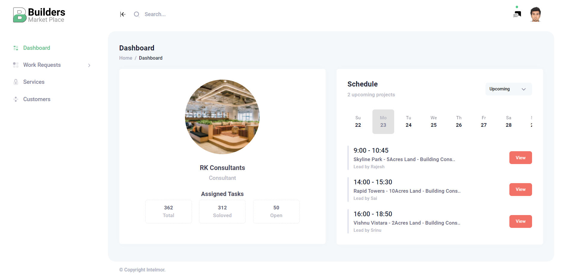 In the current residential and commercial real estate development, there are multiple stakeholders. From builders to architects to interior designers, they have to design and manage projects while implementation team members and skilled workers need a platform to collaborate and manage projects with real time sensory data. Intelli Build was designed to directly address these issues. From hiring and skilled worker market place, we provide a simple to use and a great user experience where data is collected and reported in real time.